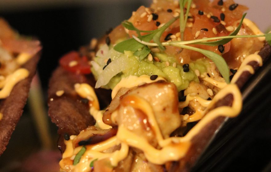 Bluefin tuna marinated with hoisinMacadamia nutsSesame oilSliced fresh avocadoYuca chips